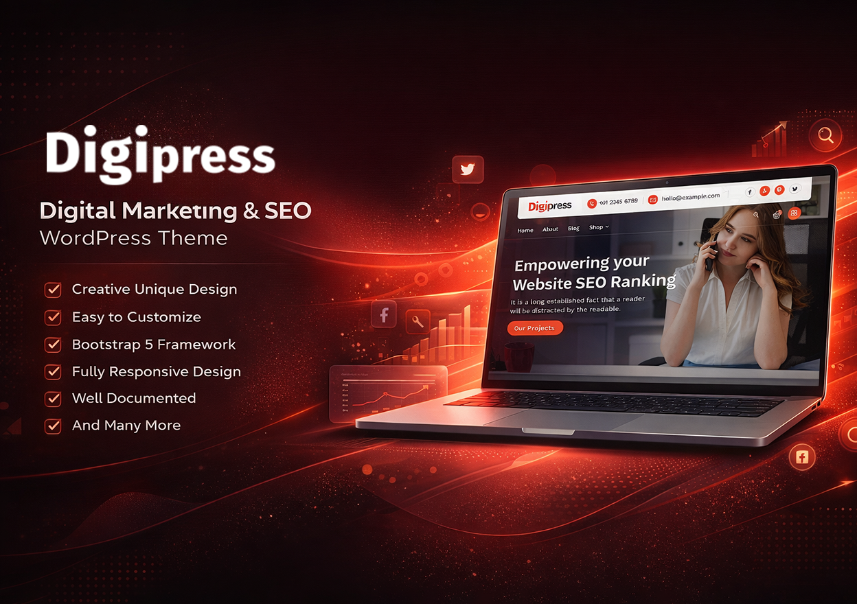 DigiPress is a Modern Multipurpose Business theme for Agency, Business, Finance, Consulting, Factory, Real Estate, Construction, Cleaning Service, Startup or any other individual website due to its adaptability. It looks perfect on all modern browsers, mobile, tablets, and any device, Theme is full of customization options and settings, you can change almost everything. DigiPress provides unique layouts Such as Service, Team, About, Gallery, Blog Pages, Shop Pages, Pricing Pages, Contact Page, Coming Soon, Careers Page, and many more. If you are a lover of creative designs and would like to build a very unique and professional website quickly then your search should end at SeoKart.